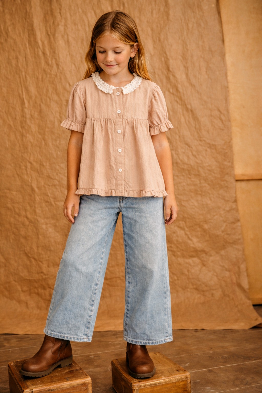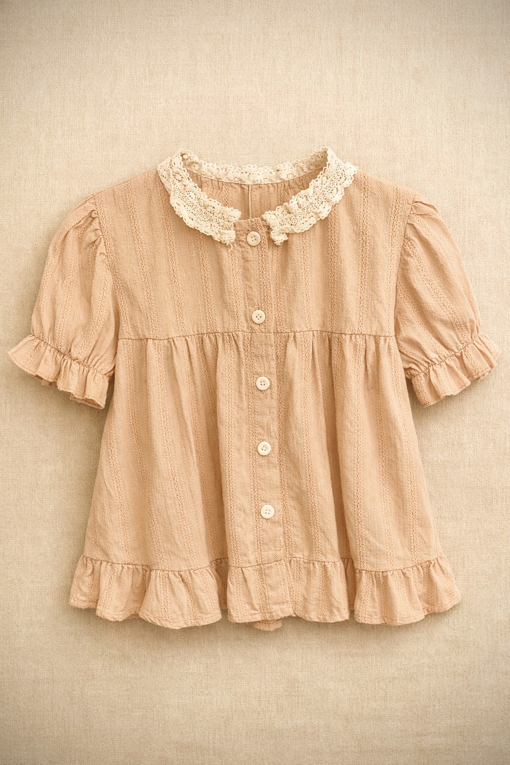 Camisa de niña de vestir, de corte amplio tipo blusa. Sus volados sutiles y los detalles delicados en el cuello aportan un encanto especial y atemporal. Gracias a su color y textura, es una prenda versátil y cómoda, ideal para acompañar distintos estilos y temporadas con elegancia natural.