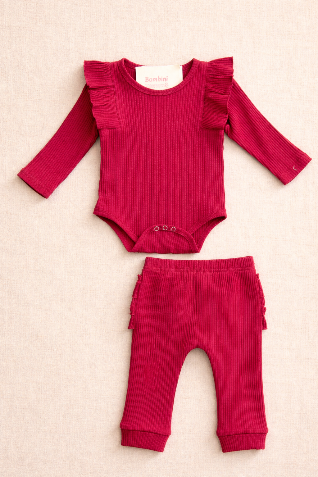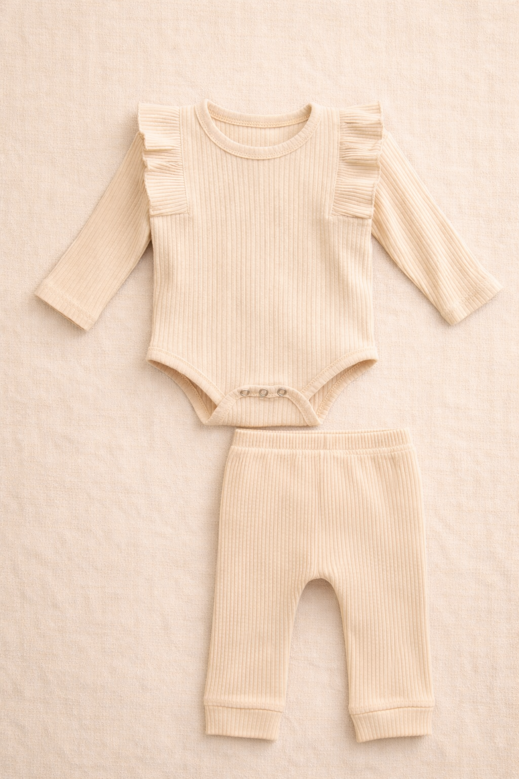 Confeccionado en tejido acanalado suave y flexible, este conjunto incluye body con volados en los hombros y pantalón con cintura elástica para un calce cómodo y seguro. La textura aporta elasticidad natural y se adapta con suavidad al cuerpo del bebé. Un diseño simple con un detalle sutil que lo hace especial. Ideal para usar solo o combinar con tejidos y abrigos en cualquier temporada. Un esencial atemporal, con ese toque femenino que marca la diferencia.