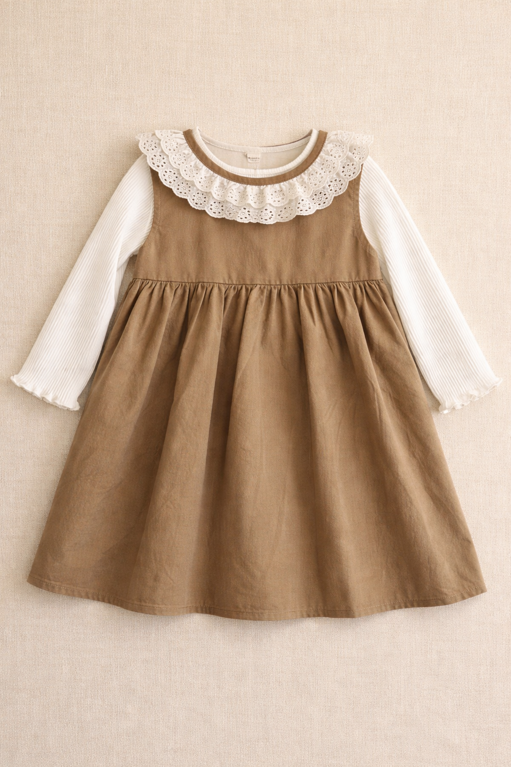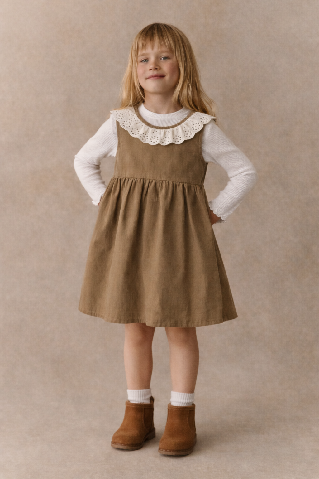 Vestido de niña en tono verde oliva oscuro, delicado y femenino. Su diseño elegante lo convierte en una prenda ideal para la temporada de otoño, fácil de combinar y de adaptar a distintos looks. Puede usarse solo o mezclarse con diferentes blusas para darle múltiples usos y estilos. Una prenda versátil, pensada para acompañar distintas ocasiones con naturalidad.